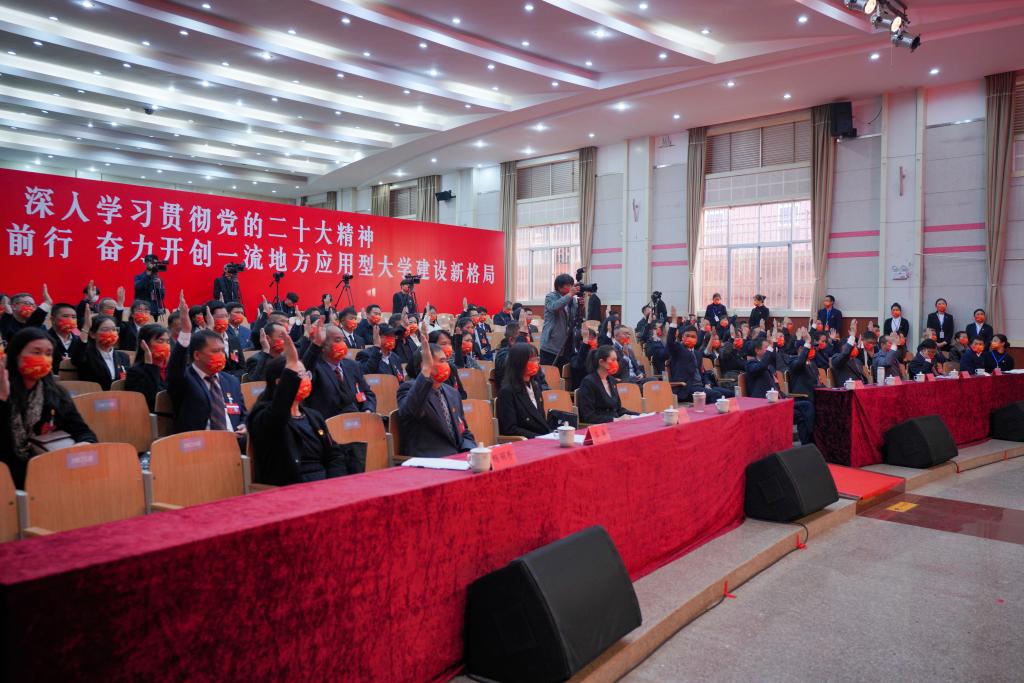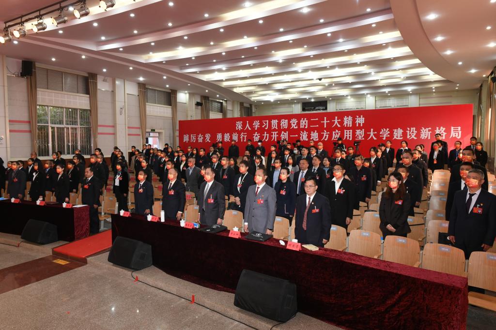 大会号召,全校各级党组织、全体党员干部和广大师生员工要更加紧密团结在以习近平同志为核心的党中央周围,以习近平新时代中国特色社会主义思想为指导,深入学习贯彻党的二十大精神,落实立德树人根本任务,坚持内涵式高质量发展,踔厉奋发,勇毅前行,奋力开创一流地方应用型大学建设新格局。